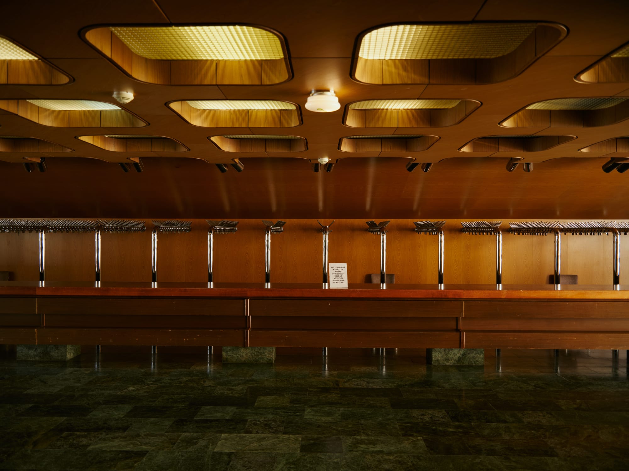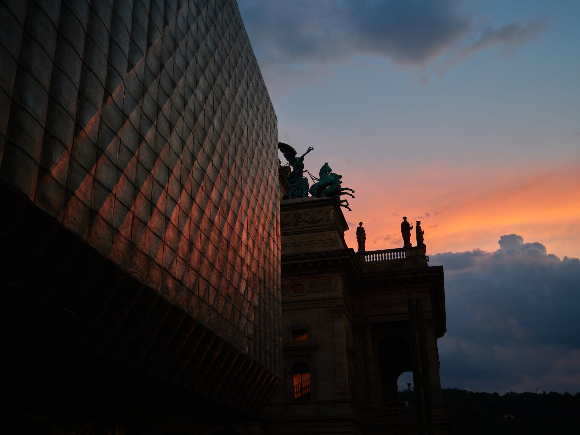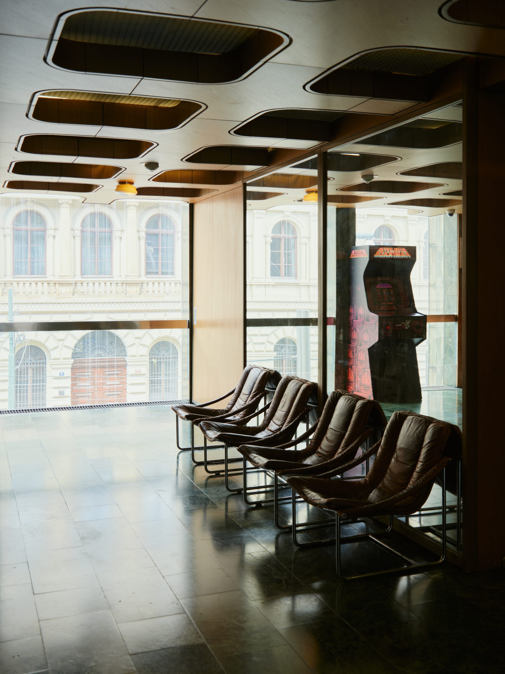 Designed by architect Karel Prager, the theatre is wrapped in glass blocks that glint differently with every hour of light. The building feels both monumental and strangely weightless, its façade an intricate lattice of repetition and transparency. Inside, the lobby glows with polished brass and dark marble, still carrying the aura of late-socialist optimism.
