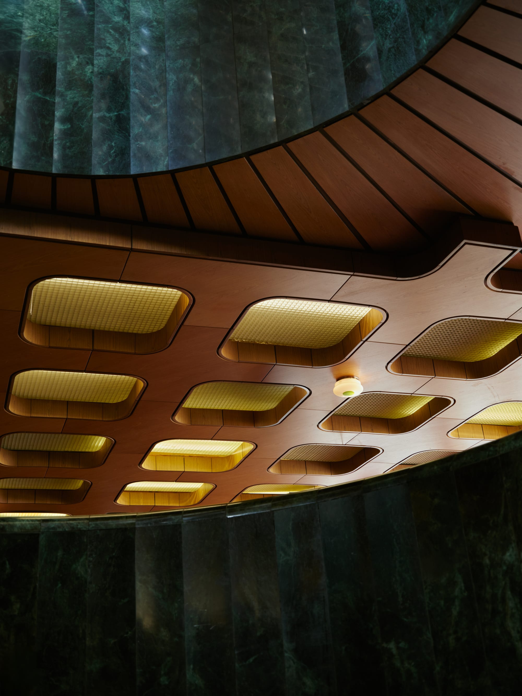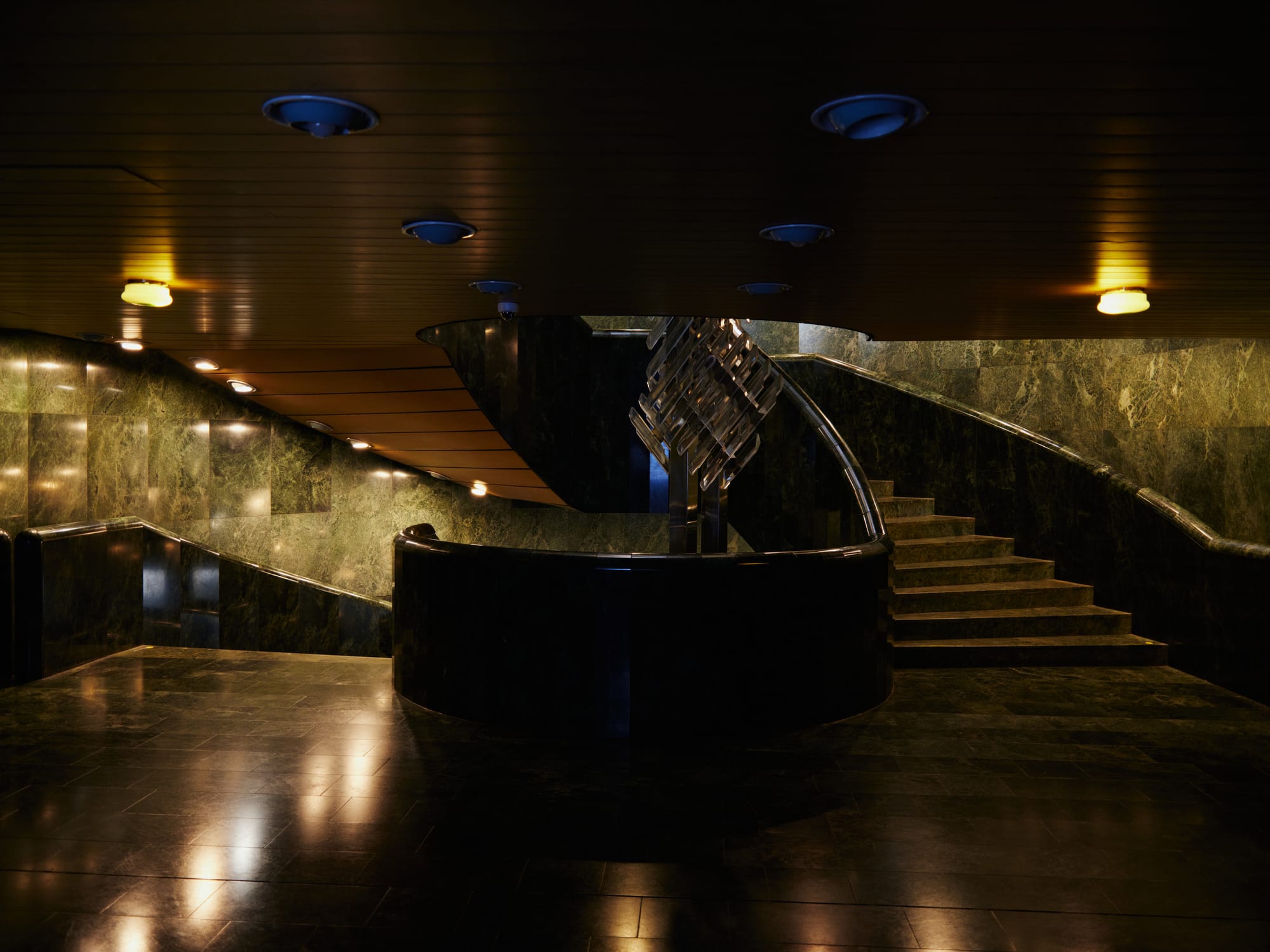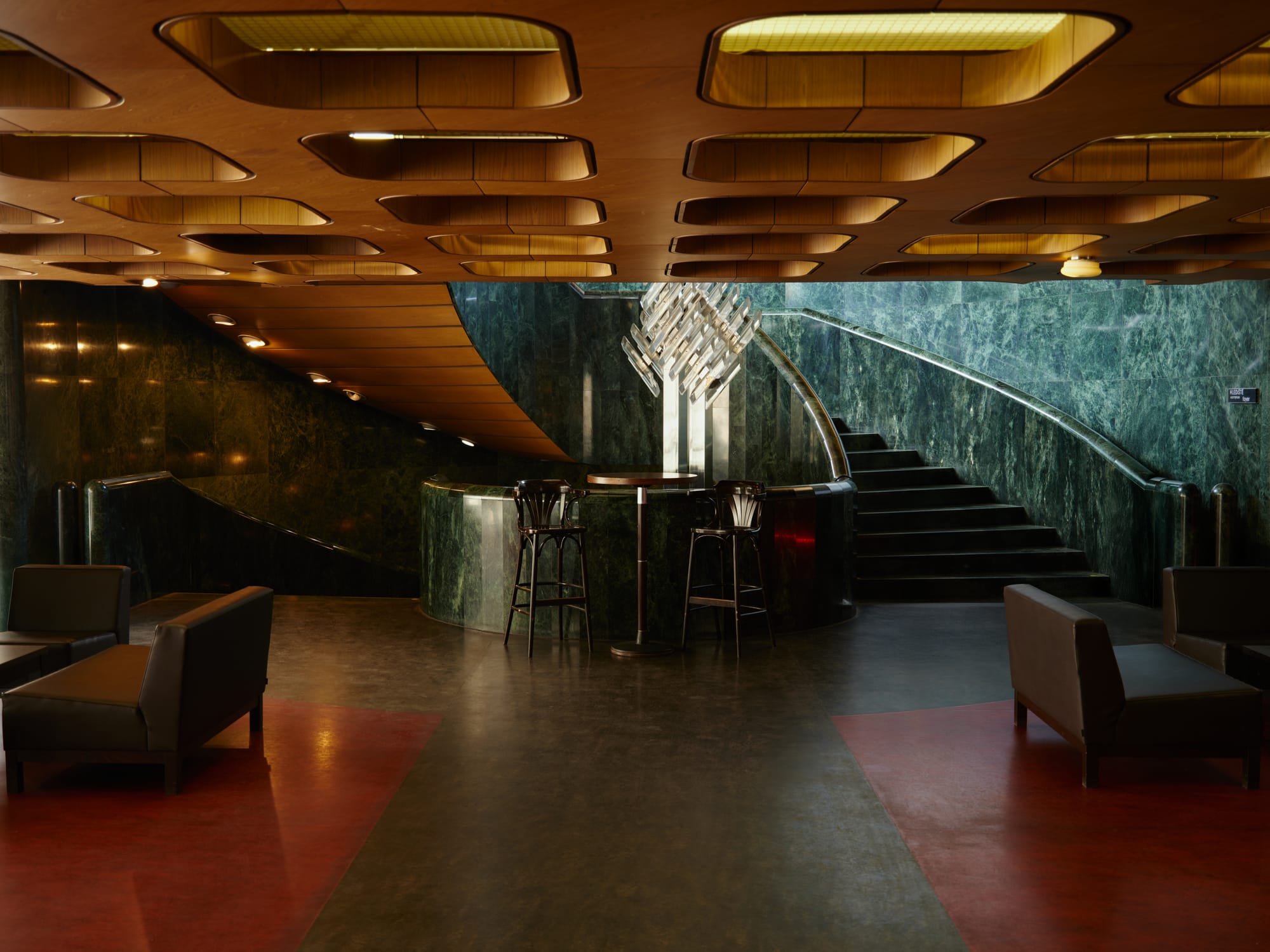 Designed by architect Karel Prager, the theatre is wrapped in glass blocks that glint differently with every hour of light. The building feels both monumental and strangely weightless, its façade an intricate lattice of repetition and transparency. Inside, the lobby glows with polished brass and dark marble, still carrying the aura of late-socialist optimism.